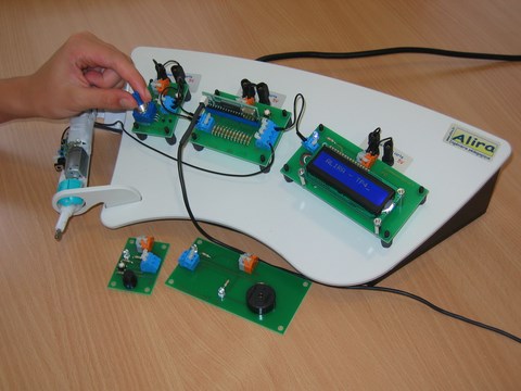 An electric toothbrush on test bench with 5 cards to illustrate the functions acquire, process, communicate, measurement accessories. Incorporates a control module ECIO for the microcontroller PIC under Flowcode programming. Comes with a USB cord and a demo software. Educational records,