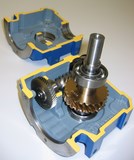 Réducteur Offre 2 coupé en deux et proposé sur support avec modification dimensionnelle pour le démontage complet et le fonctionnement en éclaté.