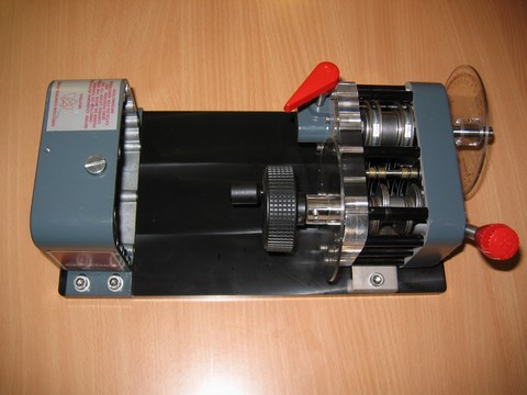 Industrial gearbox on base with a side plexi designed and assembled by CRISTOPHER for visualization and operation exploded view. Pedagogical, technical folders and resources on CD Rom.